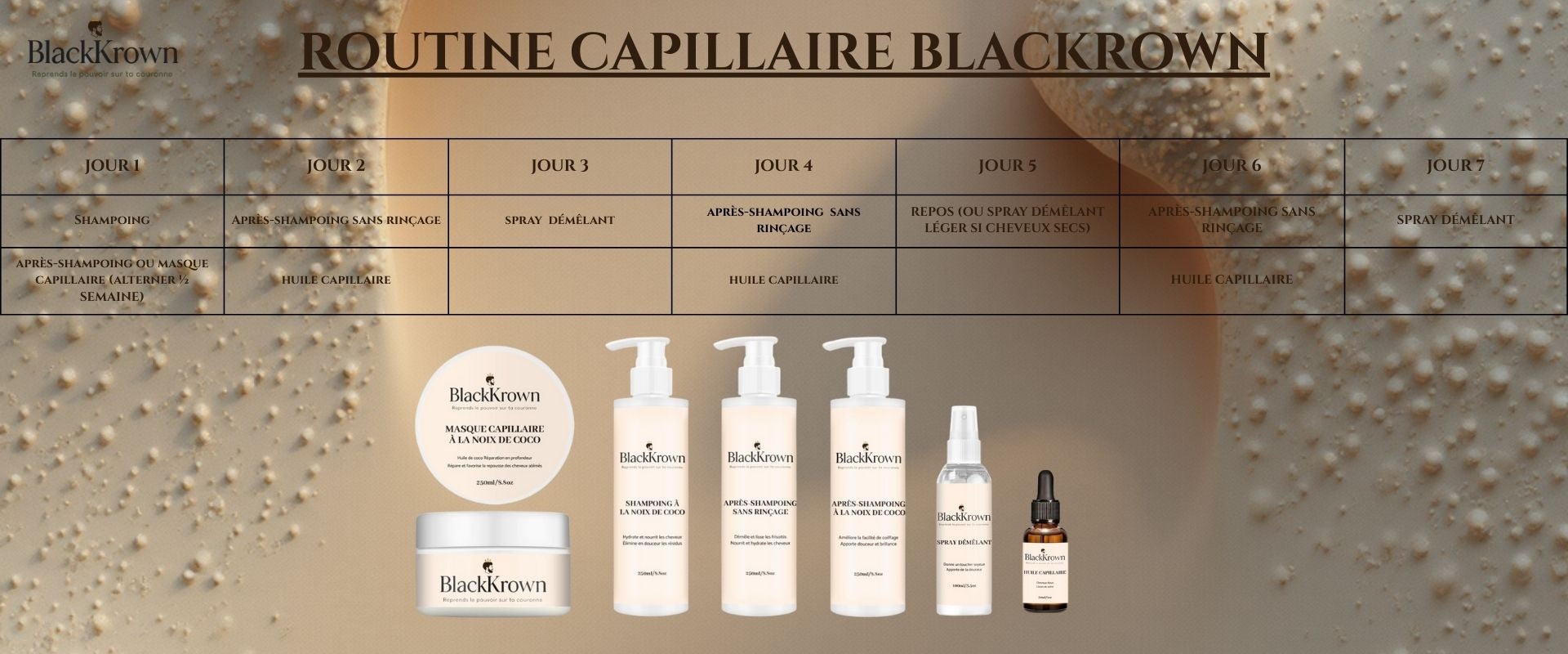 shampoing, après-shampoing, leave-in, masque, huile, spray démêlant et baume.